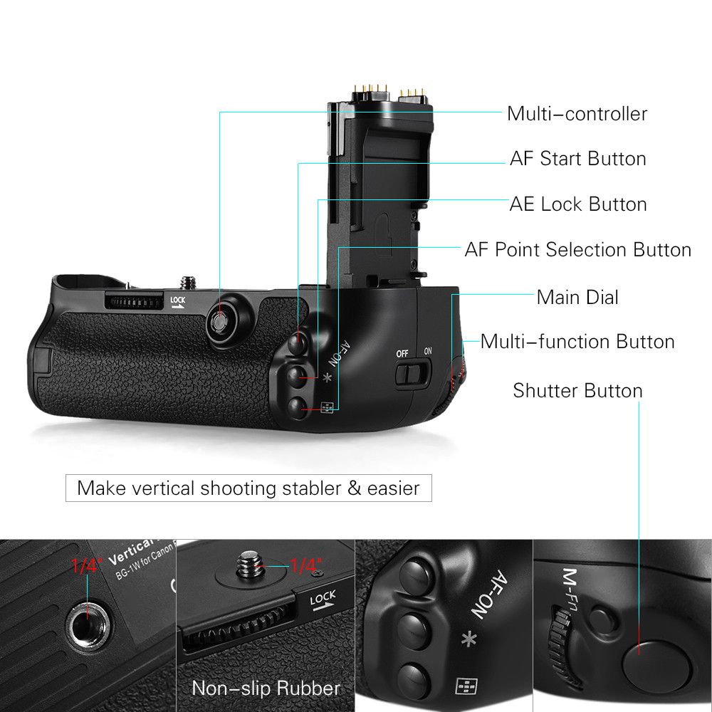Этот батарейный блок является функциональным и эргономичным дополнением для камеры Canon EOS 5D Mark IV, предназначенным для увеличения времени автономной работы и повышения удобства съёмки в вертикальной ориентации. Блок полностью повторяет конструктив и функционал оригинального Canon BG-E20, обеспечивая высокую совместимость и качественную работу при значительно более доступной цене.