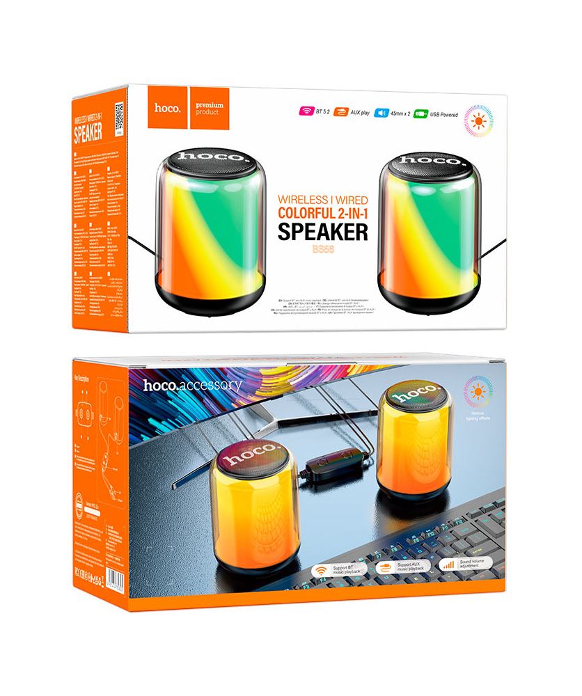Портативные колонки HOCO BS56 Colorful — это стильный и функциональный комплект из двух колонок, предназначенных для проводного и беспроводного воспроизведения стереозвука с компьютеров, ноутбуков, смартфонов и других совместимых устройств. Модель выделяется качественным звучанием, элегантным дизайном и эффектной RGB-подсветкой с 12 режимами, которая делает каждое прослушивание музыки ярким визуальным событием.