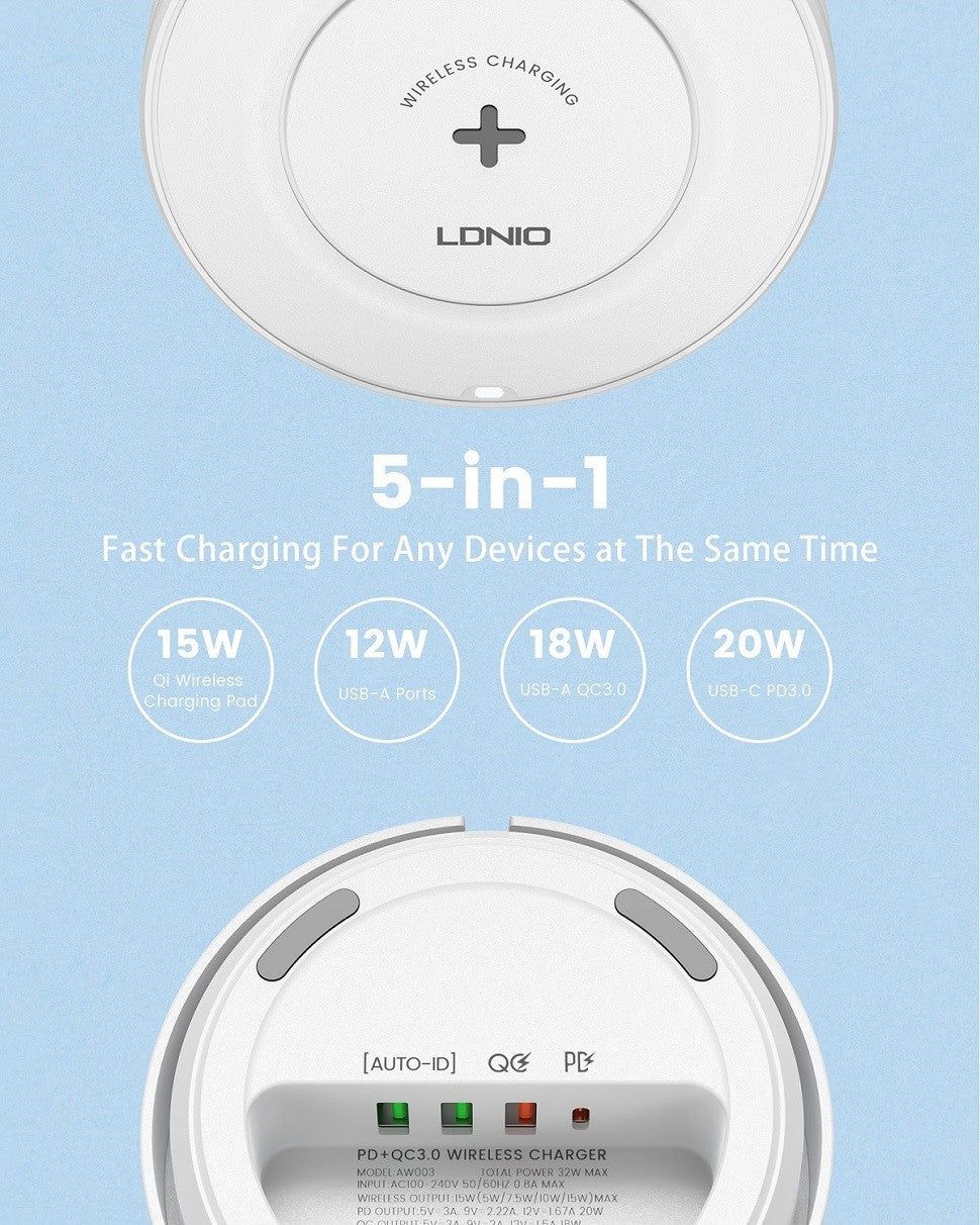 Беспроводное зарядное устройство Ldnio AW003 3 USB/ Type-C QC PD 32W белое