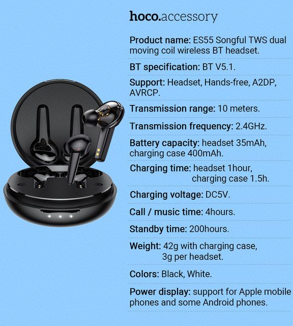 Блютуз Стерео Гарнитура Hoco ES55 Songful TWS BT5.1, 4H, 35/400mAh Белый в Киеве и Украине с быстрой доставкой Новой Почтой. Осмотр и оплата при получении или по предоплате, по Вашему желанию. Детали узнайте у нашего менеджера, обратившись по контактам продавца.