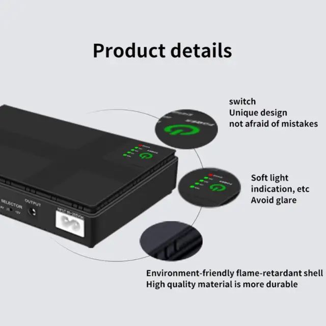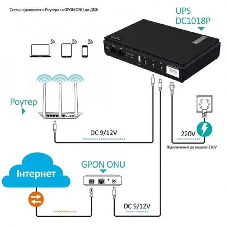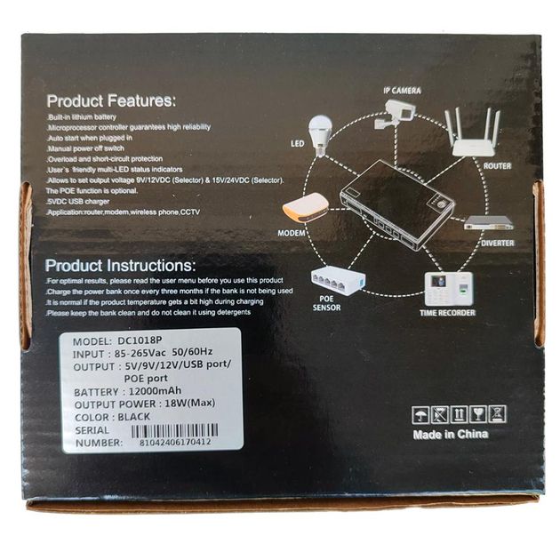 ИБП (источник бесперебойного питания) для сетевого оборудования (роутера) DC1018P - постоянный ток 12V/ 9V/ 5V 12000 mAh – мощностью 18Вт для роутера/маршрутизатора/модема, видеонаблюдения, абонентского терминала, хаба, переходников с активным питанием, сигнализаций и других подобных устройств. Так же есть функция POE (для передачи энергии через разъем RJ45) на 15В и 24В. Встроенный аккумулятор на 12000 Mah - хватает до 24 /48 часов работы роутера/модема. Данное устройство позволит быть всегда с интернетом даже когда в квартире/доме нет электроэнергии (некоторые провайдеры имеют резервное питание от аккумуляторов на точках установленного ими оборудования – можно точно об этом узнать позвонив в поддержку вашего провайдера). Можно одновременно подключить несколько устройств, например, роутер + абонентский терминал (GPON, ONU). Для включения/выключения ИБП нужно зажимать кнопку на корпусе в течение 3-4 секунд.