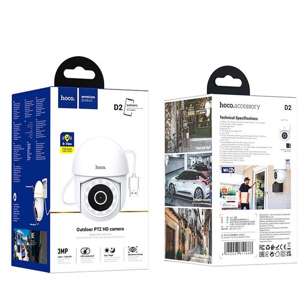 HOCO D2 – это высокотехнологичное устройство для видеонаблюдения, обеспечивающее полный контроль над происходящим в доме, на участке, парковке или в офисе. Камера оснащена функцией вращения на 355° (технология Pan-Tilt-Zoom), что позволяет охватывать максимальную площадь обзора и эффективно следить за объектами в кадре. Высокое разрешение 3 МП Super HD (2304×1296) гарантирует чёткое и детализированное изображение при любых условиях освещения.