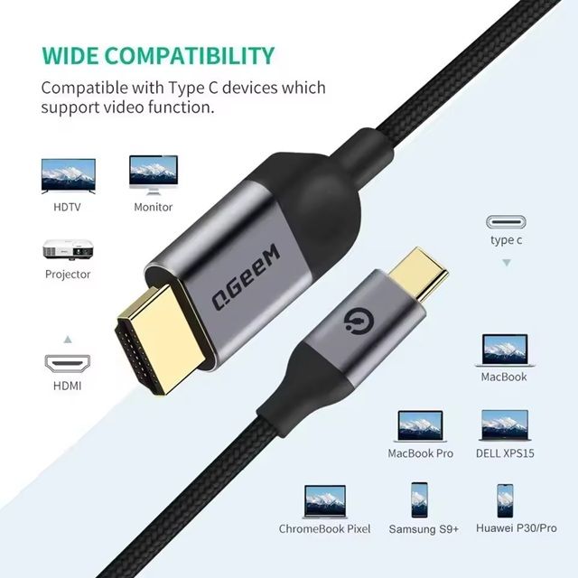 QGeeM Type-C to HDMI 4K Адаптер кабель 30Hz 1.5m, серый, металл