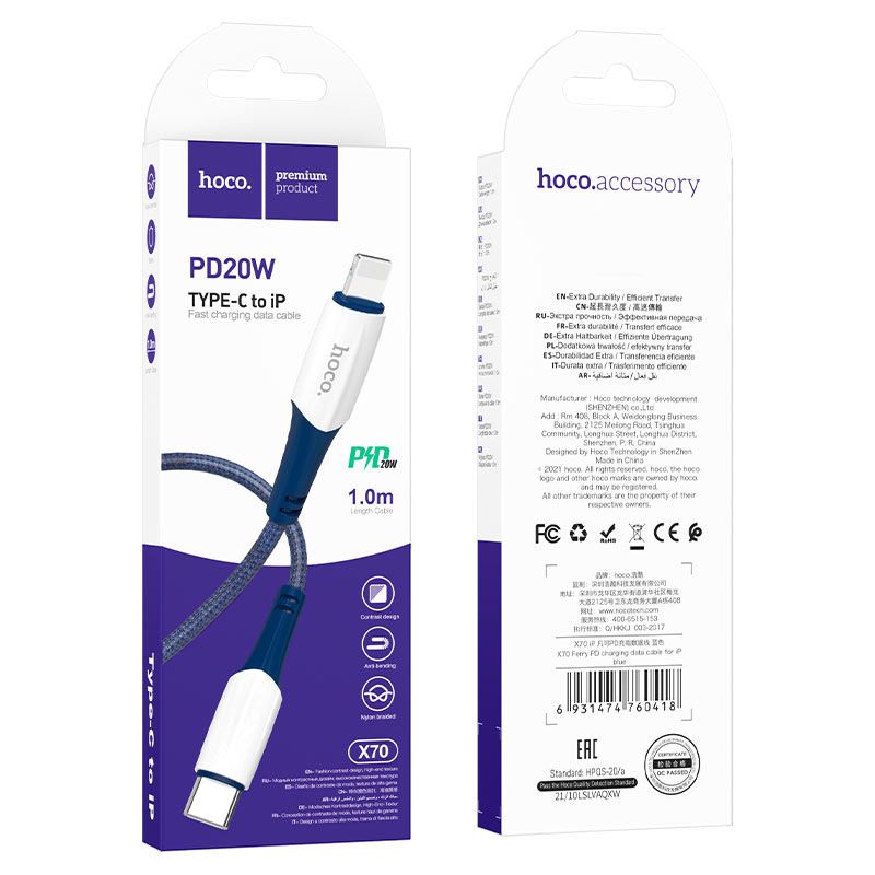 Кабель Hoco X70 Type-C to Lightning PD 1m синий