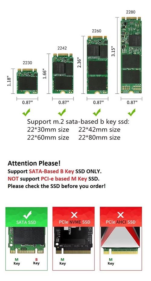 Корпус не поддерживает PCIe NVMe и PCIe AHCI SSD. Только для SATA NGFF SSD с разъёмом B Key.