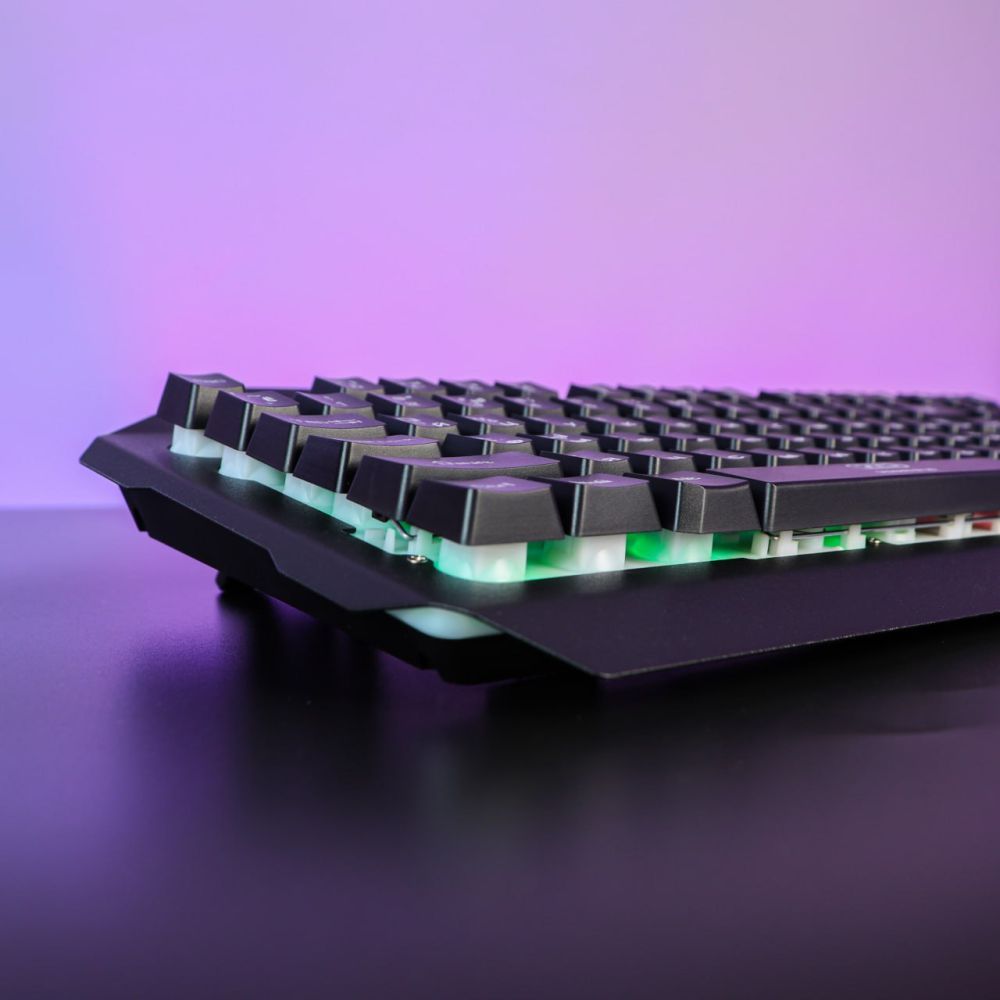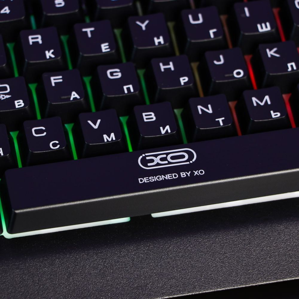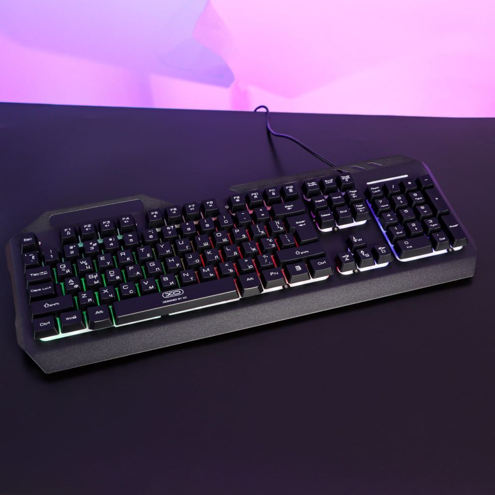 Игровая клавиатура XO KB-01 разработана с учетом потребностей самых требовательных геймеров для обеспечения максимально комфортного и эффективного игрового процесса. Модель реализована в стильном, практичном дизайне и привлекает внимание оригинально выполненной, настраиваемой RGB подсветкой, которая создает завораживающий, приятный для глаз световой эффект. Корпус аксессуара надежно собран и изготовлен из прочной комбинации ABS пластика и металла. В верхней части передней панели клавиатуры имеется прямоугольный вырез со скругленными углами, играющий роль удобной подставки для смартфона, а на нижней панели имеются выдвижные элементы, которые позволят расположить ее под углом на горизонтальной поверхности. 104 клавиши устройства отличаются легким, плавным ходом и увеличенным ресурсом нажатий, а их съемные кейкапы приподняты над верхней панелью и выполнены методом литья под давлением с четкими символами и надписями. Модель оснащена кабелем длиной 1.5 метра для подключения к компьютеру через стандартный USB интерфейс.