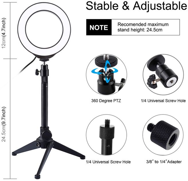 Компактная и функциональная кольцевая лампа Puluz PKT3049B 4.7" с RGBW-подсветкой и настольным штативом – это идеальное решение для блогеров, фотографов, визажистов и стримеров. Благодаря многоцветной подсветке и регулируемым режимам освещения эта лампа создаст идеальные условия для съемки и видеозаписей.