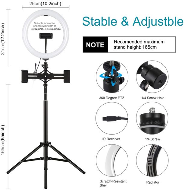 Размер светодиодного кольца: 26×26 см (26×31 см с креплением)