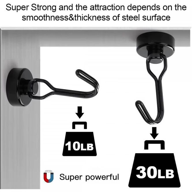 Многофункциональный магнитный крючок – это удобное и надежное решение для хранения вещей в доме, офисе или на улице. Он крепко держится на металлических поверхностях благодаря сильному неодимовому магниту, обеспечивая грузоподъемность от 4,5 до 13,5 кг (в зависимости от условий использования). Отлично подходит для подвешивания ключей, кухонных принадлежностей, инструментов, полотенец, одежды, сезонных украшений и многого другого.
