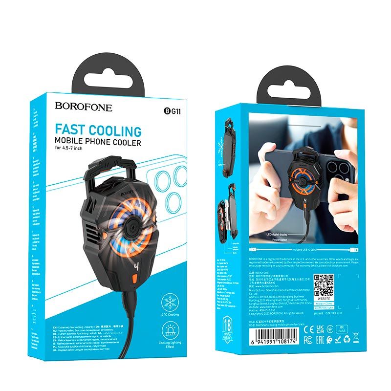 BG11 состоит из мощного вентилятора, охлаждающей конструкции и пластикового корпуса. Он легко фиксируется на телефоне с помощью 2 креплений. Температуры рабочей поверхности кулера достаточно для быстрого охлаждения даже сильно нагретого смартфона. Питание осуществляется с помощью кабеля Type-C, который входит в комплектацию. Кулер имеет компактный дизайн и легко помещается в карман или сумку, что делает его идеальным для использования в любом месте. Он совместим со всеми моделями iPhone и Android с диагональю 4.5-7". Небольшой цифровой дисплей проинформирует Вас о текущей температуре прибора.