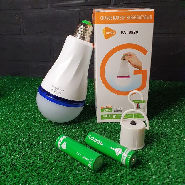 Лампа аккумуляторная FA-6920 светодиодная E27 20W 6800 К Автономная аварийная, с двумя сменными аккумуляторами 18650 в комплекте.