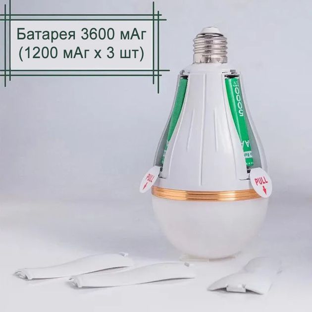 Она имеет в комплекте сменный аккумулятор 18650 (3шт), который заряжается от сети при включении в розетку E27 и поддерживает свет в течение 3-4 часов при выключении электроэнергии.