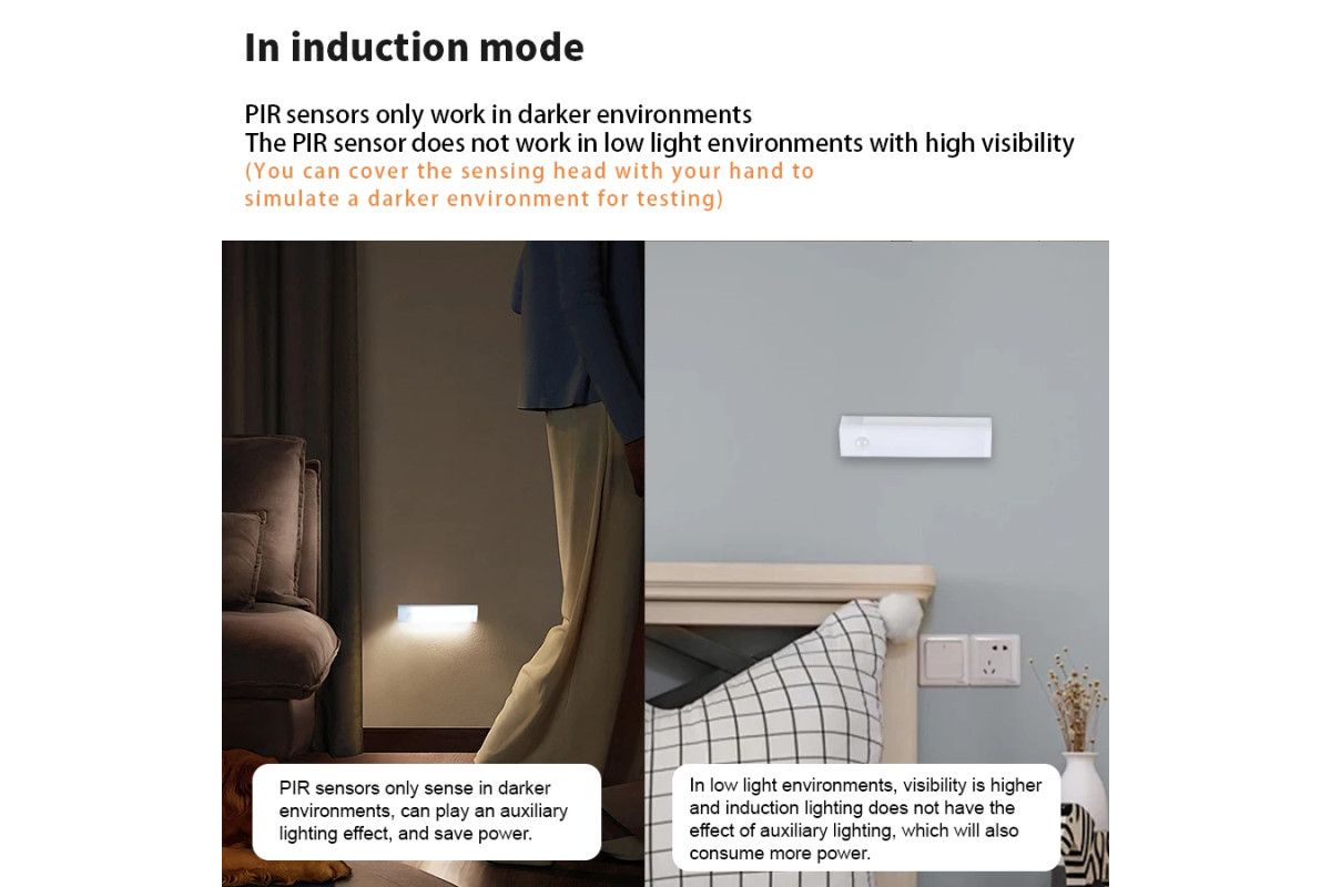 Оснащён датчиком движения и освещения, автоматически включающим свет при обнаружении движения в темноте, обеспечивая эффективное освещение и повышая безопасность вашего пространства. При наличии освещения в помещении датчик движения этого светильника не сработает, что сэкономит заряд аккумулятора. Он работает только в темноте и только при обнаружении движения.