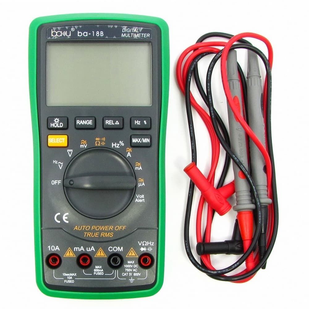 Baku BA-18B – это цифровой мультиметр производства компании Baku, который активно применяется как новичками, так и профессионалами при измерении постоянного и переменного тока, постоянного и переменного напряжения, сопротивления, емкости и частоты. Модель BA-18B оборудована функцией автоматического режима выбора диапазона измерений, что значительно ускоряет измерение. Кроме того, многофункциональный прибор позволяет тестировать диоды и проверять целостность цепи с помощью звуковой индикации. Мультиметр оборудован большим ЖК-дисплеем с подсветкой, благодаря чему работа даже в недостаточно освещенных помещениях становится проще. Функция измерения сигналов с переменной частотой позволяет измерять показания даже при работе прибора. Безопасность таких измерений обеспечивается прорезиненным корпусом, который не скользит и надежно лежит в руке.