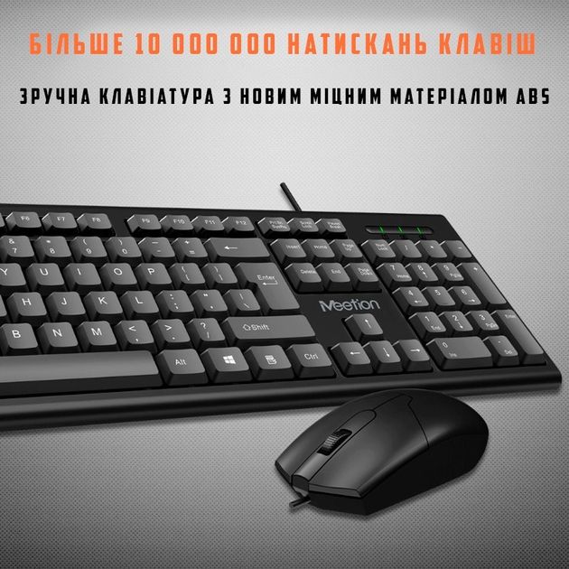 Meetion MT-C100 – это удобный и надежный комплект из проводной клавиатуры и проводной мыши, идеально подходящий для офисной работы, учебы и повседневного использования. Благодаря эргономичному дизайну, водонепроницаемой конструкции и качественным материалам этот комплект станет отличным выбором для комфортной работы за компьютером.