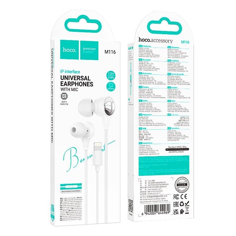 HOCO M116 Benevolent universal earphones with microphone |lightning, 1.2M| white