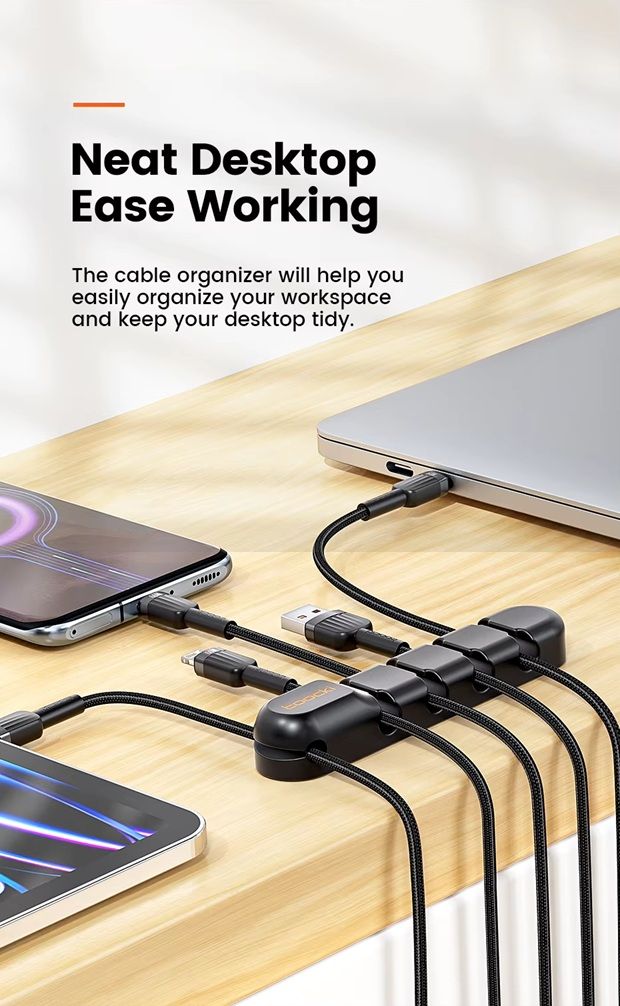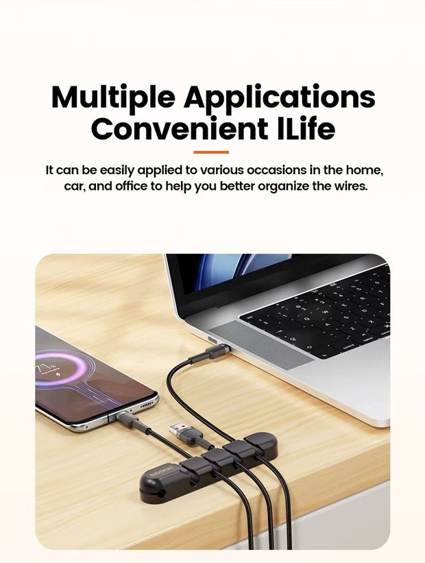 - Помогает поддерживать порядок на столе, в автомобиле или дома, предотвращая спутывание и перегибы кабелей.
