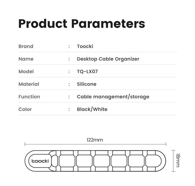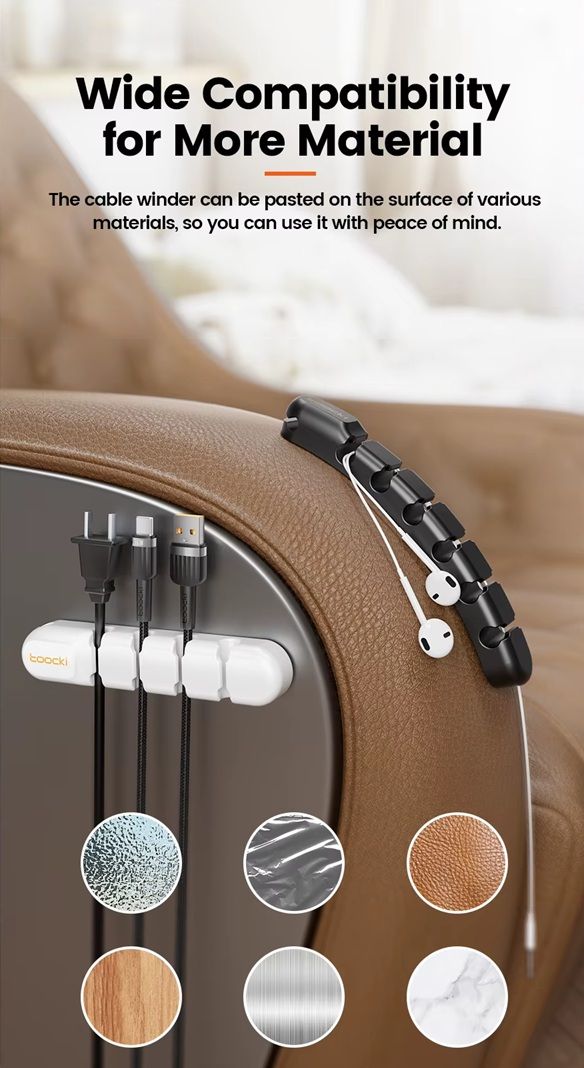 Органайзер для кабелей Toocki TQ-X02 – это удобное решение для упорядочивания проводов на рабочем столе, в офисе, автомобиле или дома. Благодаря прочному двустороннему скотчу, он надежно фиксируется на любой гладкой поверхности, предотвращая спутывание кабелей и обеспечивая порядок в пространстве.