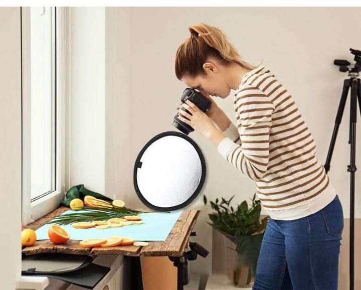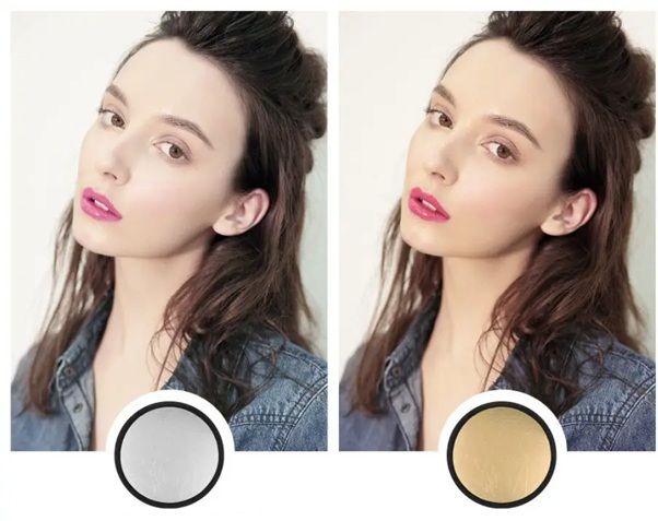 - Серебристая сторона усиливает свет, делая его более ярким и контрастным, что особенно полезно при съемке в условиях недостаточной освещенности. Золотая сторона создает теплый, мягкий свет, придавая коже естественный и приятный оттенок, что идеально подходит для портретной съемки.