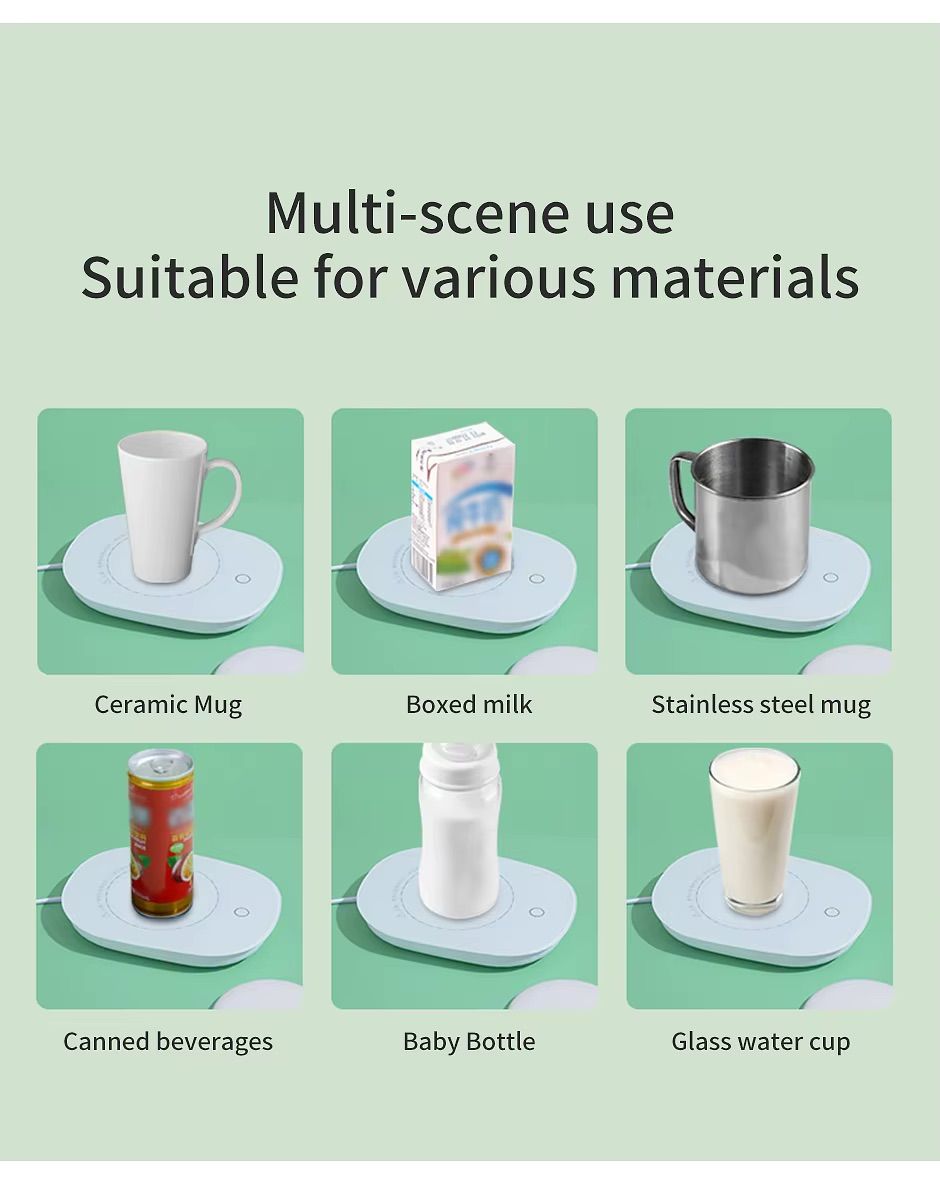 Гравитационная подставка автоматически отключается, когда чашка снимается с нагревательной подставки, и безопасна для большинства чашек из нержавеющей стали, детских бутылочек, керамических чашек, стаканов и т.д.