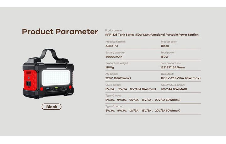 Электростанция Портативная REMAX Tank Series 150W Power Station RPP-325 36000mAh |3USB/Type-C/DC/AC| черная