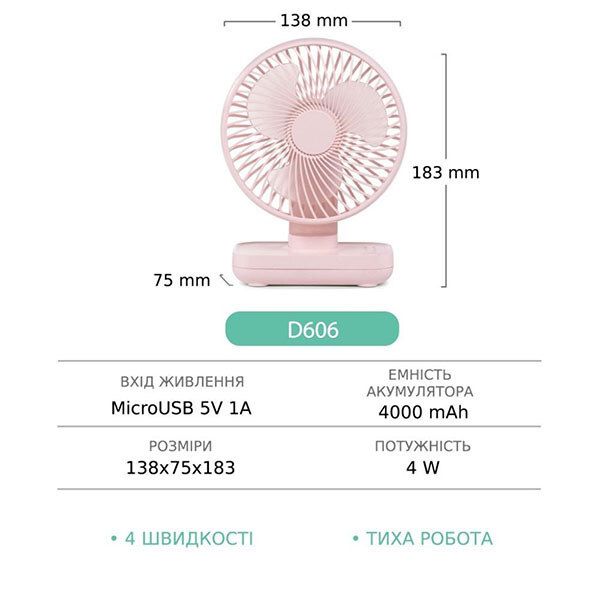 Настольный вентилятор GXQC D606 розовый - компактный и мощный портативный вентилятор с безщеточным двигателем. Оснащенный 18650 литиевой батареей емкостью - 4000 mAh, он обеспечит вам непрерывный поток свежего воздуха до 8 часов. За счет возможности питания от любого USB порта 5V его можно подключить к сетевому адаптеру, повербанку или ноутбуку с помощью кабеля который идет в комплекте.