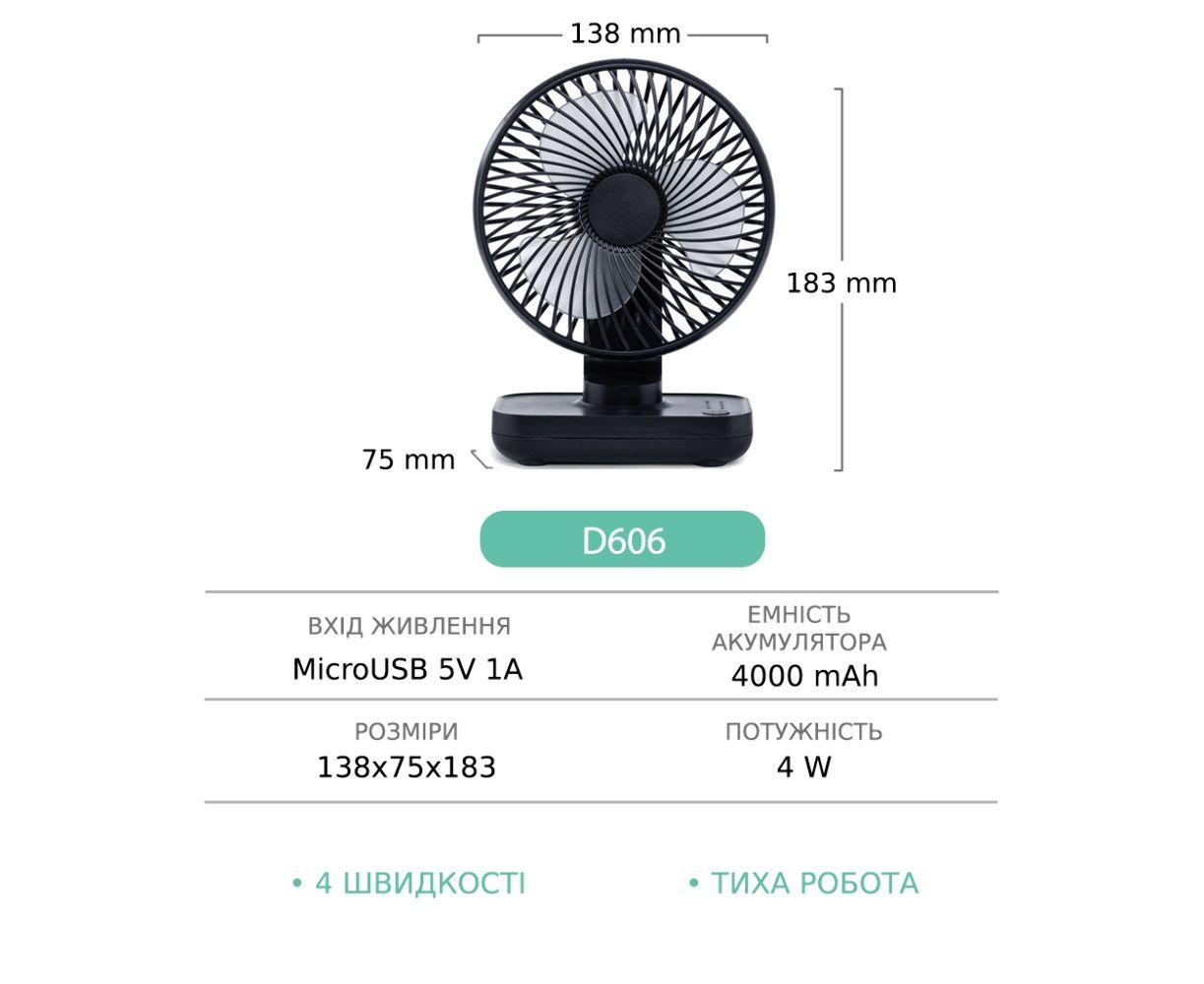 Настольный вентилятор GXQC D606 тёмно-серый - компактный и мощный портативный вентилятор с безщеточным двигателем. Оснащенный 18650 литиевой батареей емкостью - 4000 mAh, он обеспечит вам непрерывный поток свежего воздуха до 8 часов. За счет возможности питания от любого USB порта 5V его можно подключить к сетевому адаптеру, повербанку или ноутбуку с помощью кабеля который идет в комплекте.