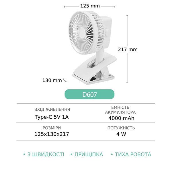 Настольный вентилятор GXQC D607 с прищепкой белый - компактный и мощный портативный вентилятор с безщеточным двигателем. Оснащенный 18650 литиевой батареей емкостью - 4000 mAh, он обеспечит вам непрерывный поток свежего воздуха до 8 часов. За счет возможности питания от любого USB порта 5V его можно подключить к сетевому адаптеру, повербанку или ноутбуку с помощью кабеля который идет в комплекте.