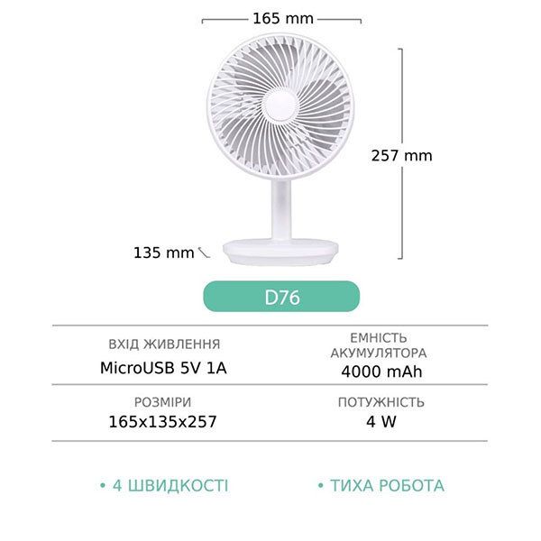 Портативный настольный вентилятор GXQC D76 4000 mAh на аккумуляторе, беспроводной, белый