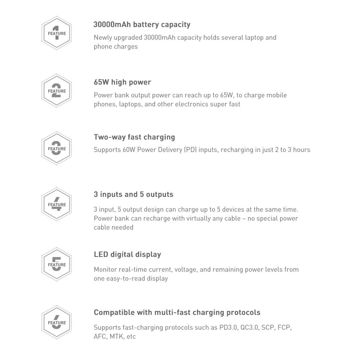 Большая емкость 30000 mAh обеспечит зарядку вашего смартфона, планшета или ноутбука на протяжении семи дней, без необходимости часто заряжать сам повербанк.
