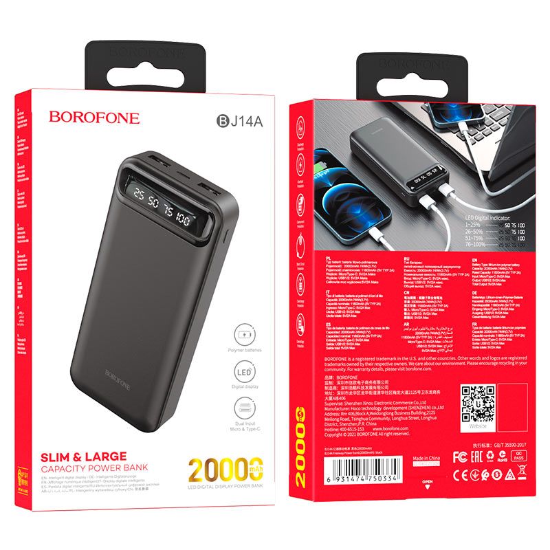 Повербанк Borofone BJ14A 20000 mAh 2USB 5V,2A / In: Type-C, micro-USB 5V,2A / LED indicator, black