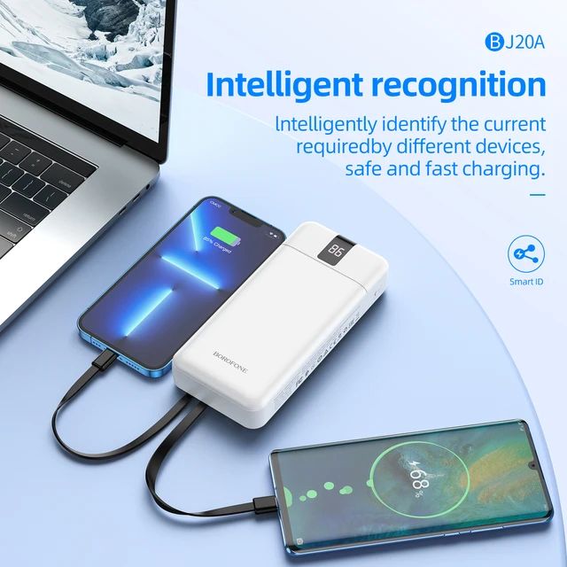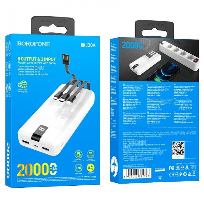 Повербанк Borofone BJ20A (20000 mAh 2USB, micro, Type-C, Lightning 5Vx2A / In: Type-C, micro-USB, USB, 5Vx2A ) LED, White