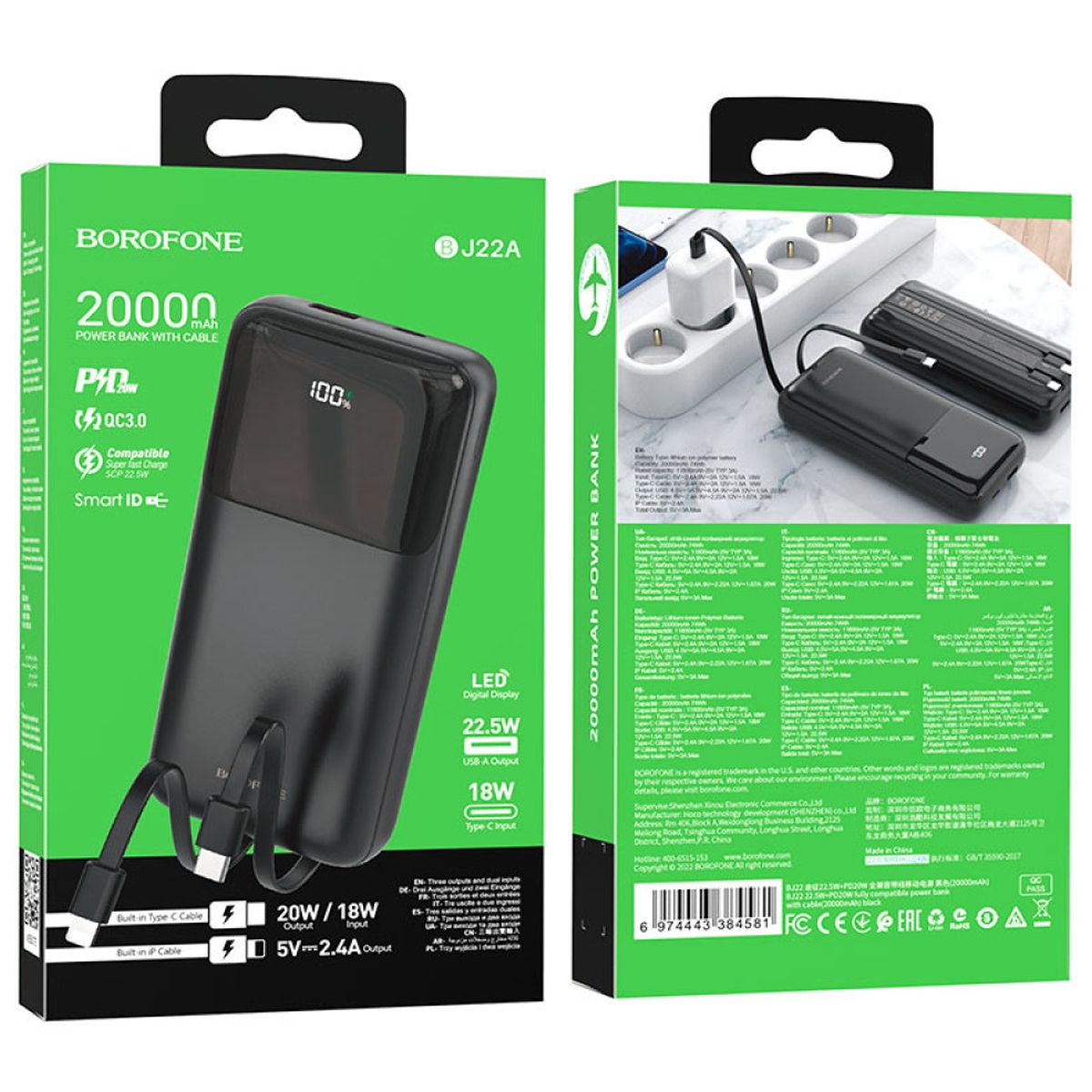 Повербанк Borofone BJ22A 20000mAh | USB 22,5W QC3.0, Type-C 20W PD, Lightning 10W | In: Type-C 18W, + Cable Type-C 18| LED Display, Black