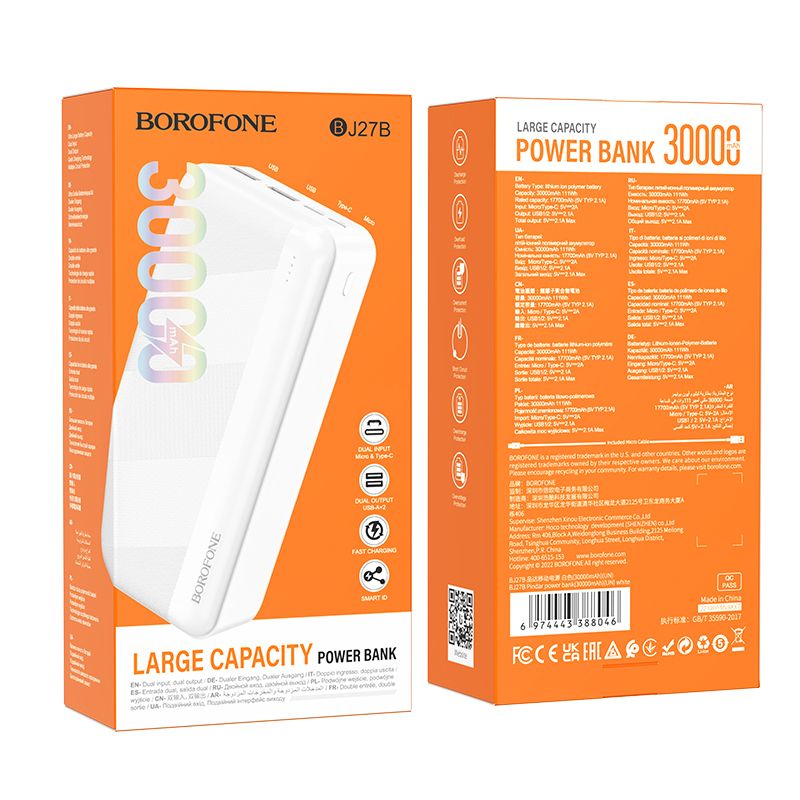 Borofone BJ27B Повербанк (30000 mAh / Out: 2USB 5V*2.1A / In: Type-C, micro-USB) LED indicator, white