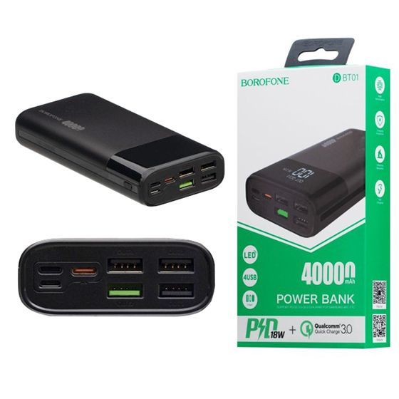 Power Bank Borofone DBT01 (40000mAh / Out: 4xUSB-A 18W QC3.0, Type-C 18W PD / In: Lightning, micro-USB, Type-C PD18W 5V/3A ) с LED Дисплеем, Чёрный в Киеве и Украине с быстрой доставкой Новой Почтой. Осмотр и оплата при получении или по предоплате, по Вашему желанию. Детали узнайте у нашего менеджера, обратившись по контактам продавца.