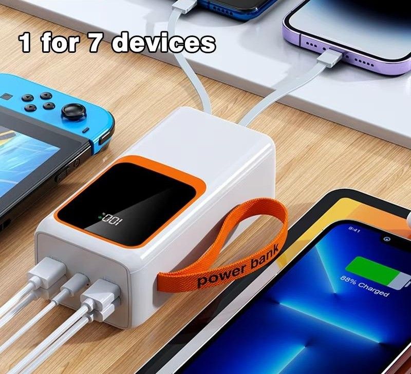 - 4 порта USB-A, 1 USB-C (PD) и встроенные кабели Type-C и Lightning
