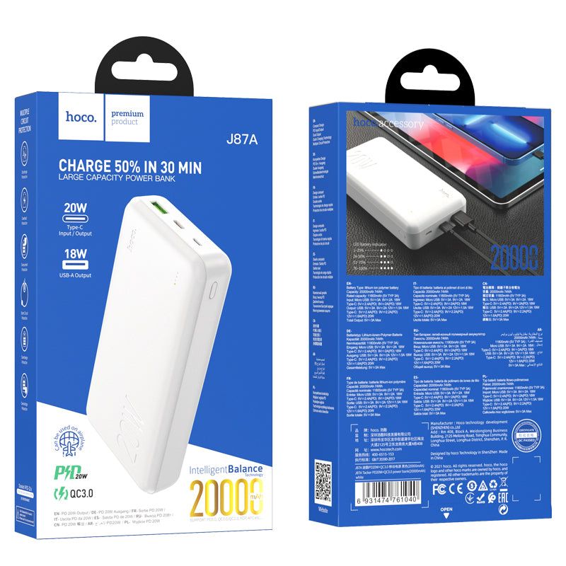 Повербанк Hoco J87A (20000 mAh / Out: USB 18W QC3.0, Type-C 20W PD / In: Type-C 18W, micro 18W) с LED индикатором, Белый