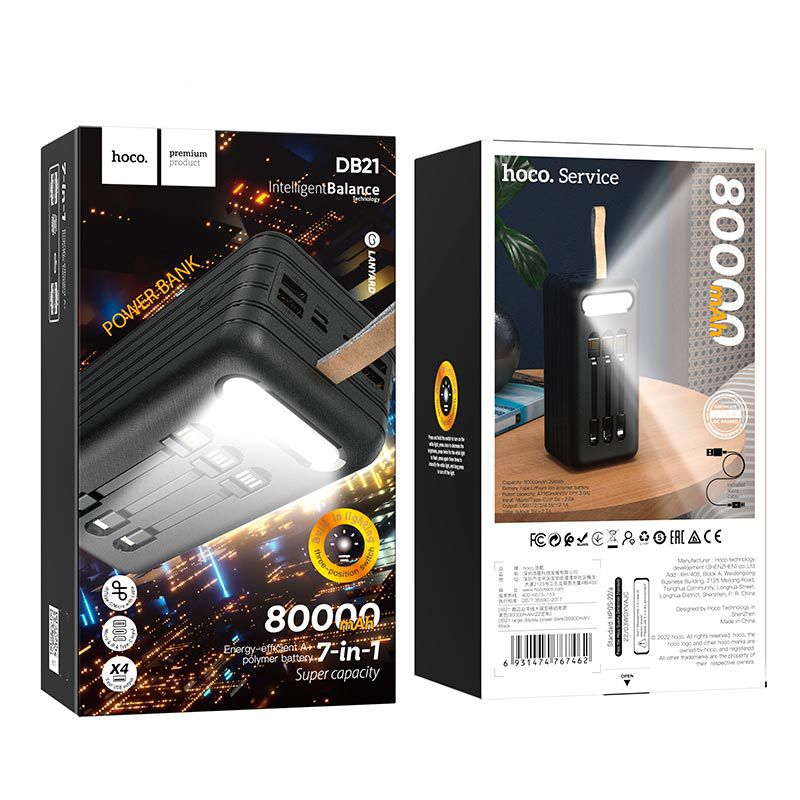 Повербанк HOCO DB21 – это надежное устройство для длительного автономного использования, способное заряжать сразу несколько устройств и выполнять функцию фонаря. С чрезвычайно высокой емкостью аккумулятора 80000 mAh и продуманным дизайном, эта модель идеально подходит для тех, кто нуждается в постоянном доступе к электроэнергии, даже находясь далеко от цивилизации.