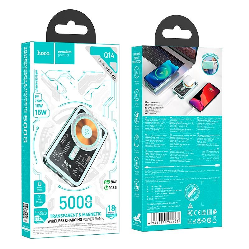 Очень часто случается так, что в самый неподходящий момент мобильный может просто разрядиться. Первое, что приходит в голову – это подключиться к розетке. Но когда АКБ сел в лесу, этот выход из ситуации сразу отпадает. Но есть одно решение – воспользоваться повербанком Hoco Q14 Ice Crystal 5000 mAh PD20W MagSafe, ведь он сможет отдать драгоценную энергию телефону. С Power Delivery, с быстрой зарядкой Quick Charge, с беспроводной зарядкой, с MagSafe и с дисплеем он лучше всего подойдет для телефона, для беспроводных наушников, для смарт-часов и браслетов для айфона и поразит современным видом и функциональными особенностями.