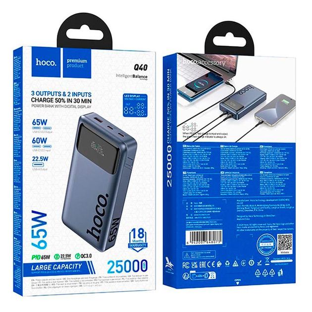 HOCO Q40 25000mAh Leader Powerbank with Dark Digital Display |1USB/2Type-C, PD/QC, 65W/3A| grey