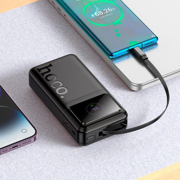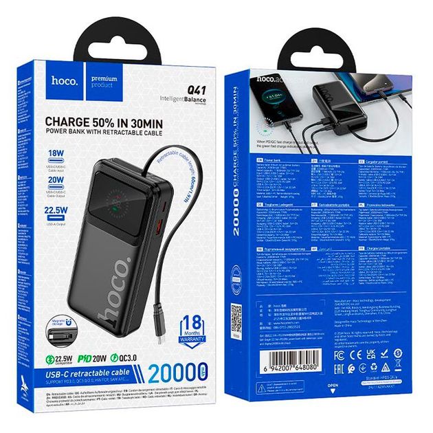 HOCO Q41 20000mAh Bright Powerbank with Telescopic Cable and Display |1USB/1Type-C, PD/QC, 22.5W/3A| black