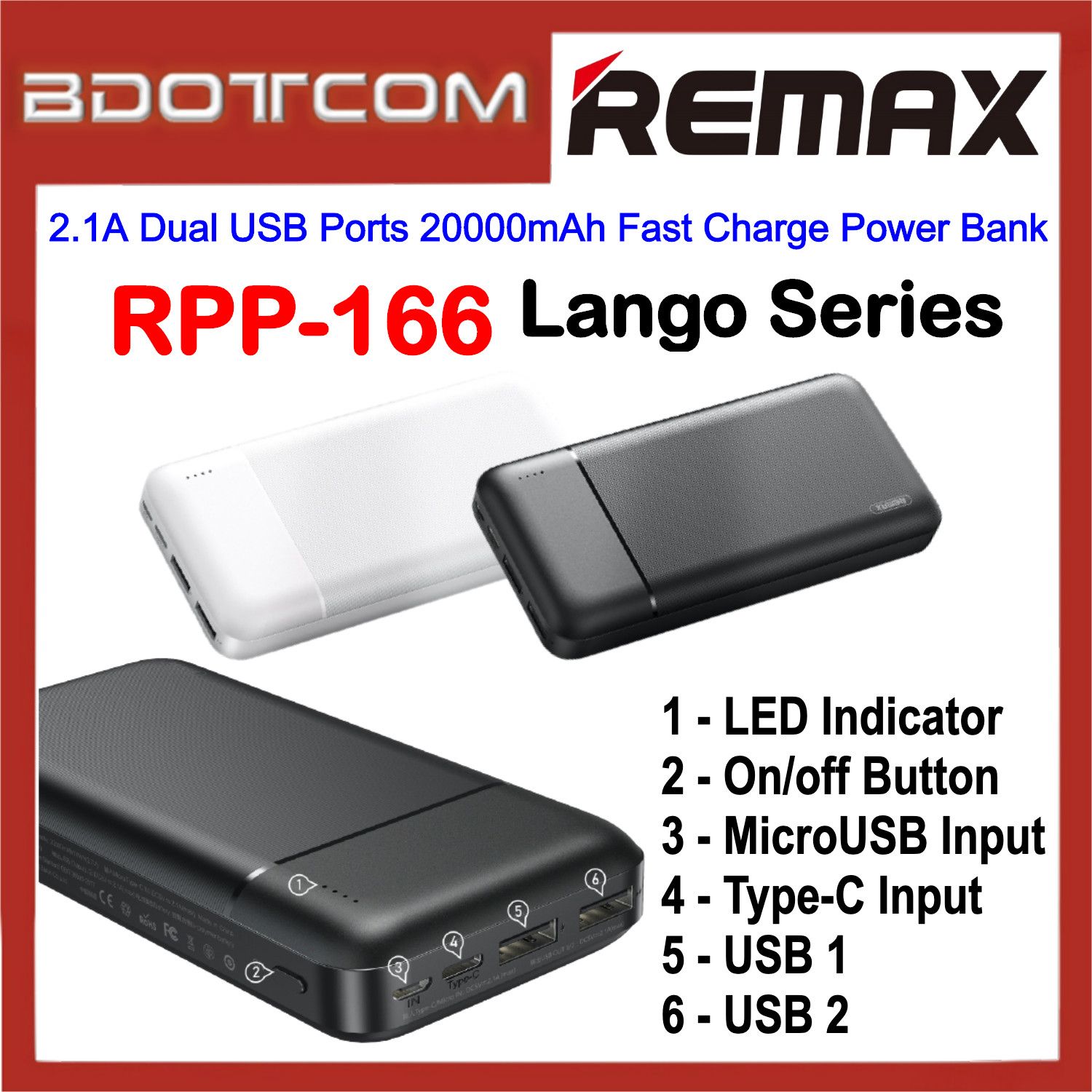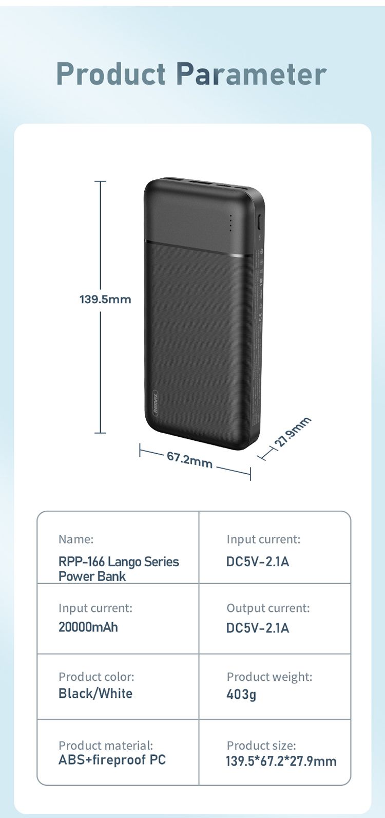 Повербанк Remax RPP-166 Lango (20000 mAh / Out: 2USB 5V/2.1A / In: Type-C, micro-USB 5V/2.1A ) с LED индикатором, Чёрный