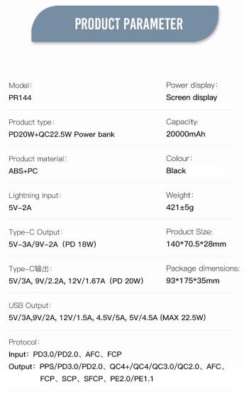 Повербанк XO PR144 (20000mAh / Out: USB-A 22.5W QC3.0,Type-C PD 20W / In: Lightning, Type-C 18W ) с LED Дисплеем, Белый