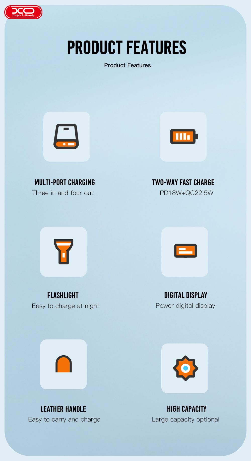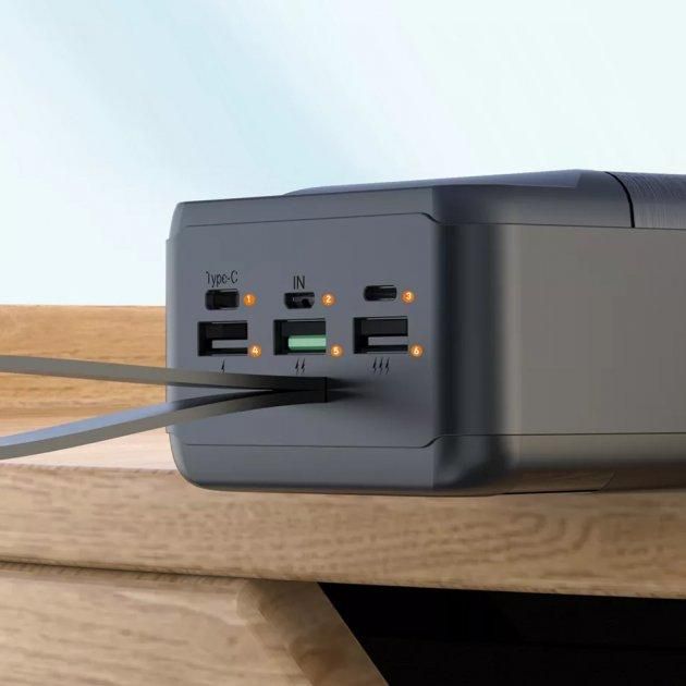 Power Bank XO PR159 - надежный аксессуар, который станет отличным выбором для использования во время путешествий и походов, благодаря батарее емкостью 60000mAh и LED фонарю. Модель выполнена в стильном, практичном дизайне, текстурированная лицевая панель и выделенный дисплей, отображающий уровень заряда, придают ей привлекательности и обеспечат пользователю приятные тактильные ощущения. Комфорт в повседневную эксплуатацию внесет удобный, прочный ремешок. Для изготовления аксессуара используются качественные электронные компоненты, огнестойкие поликарбонат и ABS пластик. Повербанк поддерживает двухстороннюю быструю зарядку: протоколы PD3.0/2.0, AFC, FCP для его зарядки и PPS, PD3.0/2.0, QC3.0/2.0, AFC, FCP для зарядки сторонних гаджетов. В его торце находятся разъемы Micro-USB и Lightning, пара USB портов с общей силой тока на выходе 2А, USB порт с исходящей мощностью 22.5Вт и разъем Type-C, способный попускать ток в обе стороны, исходящая мощность на его выходе - 20Вт. Максимальная мощность на входе - 18Вт.