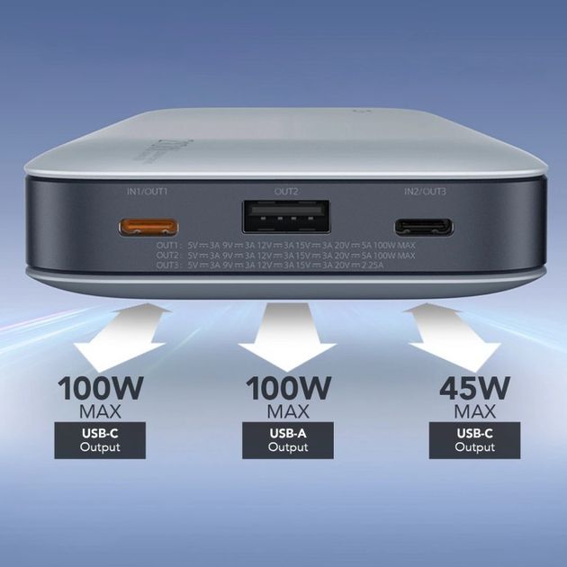 USB-A: 5 В / 3 А, 9 В / 3 А, 12 В / 3 А, 15 В / 3 А, 20 В / 5 А 100 Вт MAX (требуется прилагаемый фирменный кабель USB-A - USB-C)