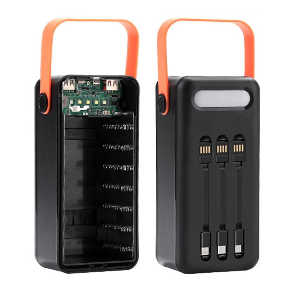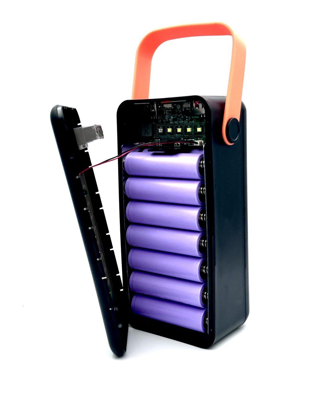 Это корпус, который позволяет создать повербанк с любой емкостью, в зависимости от устанавливаемых аккумуляторов. В данном комплекте к нему идет 21 аккумулятор 18650 с емкостью по 3200 мАч каждый. Он изготовлен из прочного пластика и имеет современный дизайн и 4 USB выхода для проводной зарядки разных устройств. Также он имеет 2 встроенных фонаря, которые могут использоваться для освещения во тьме.