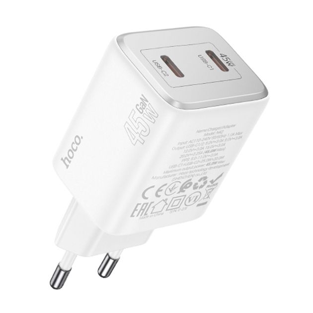 Сетевое зарядное устройство Hoco N42 2 Type-C PD 45W в белом цвете — это мощное и компактное зарядное устройство, которое поддерживает быструю зарядку различных устройств с интерфейсом USB Type-C, включая ноутбуки, смартфоны, планшеты и другие гаджеты.