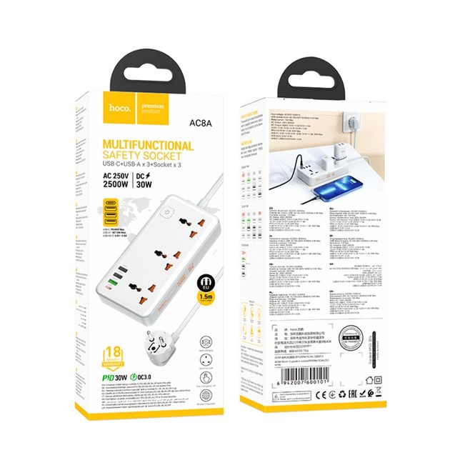 Hoco AC8A — это многофункциональный удлинитель, объединяющий функции сетевого фильтра и зарядного устройства, что делает его идеальным помощником для вашего дома или офиса. Благодаря поддержке различных стандартов быстрой зарядки, он обеспечивает удобное и безопасное подключение для всех ваших устройств.