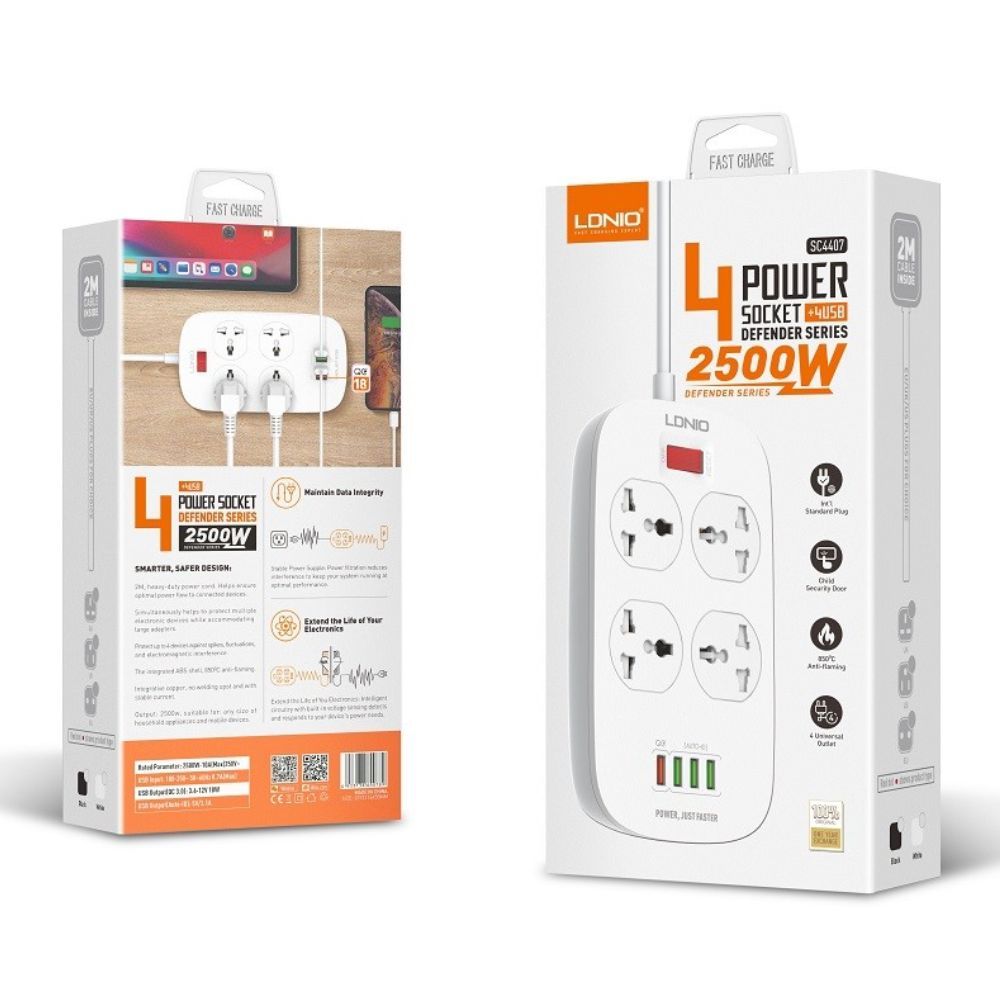 LDNIO SC4407 Удлинитель сетевой |2500W, 2m EU Plug, 4 USB, 4 розетки. QC3.0, 3.1A|/8W| белый