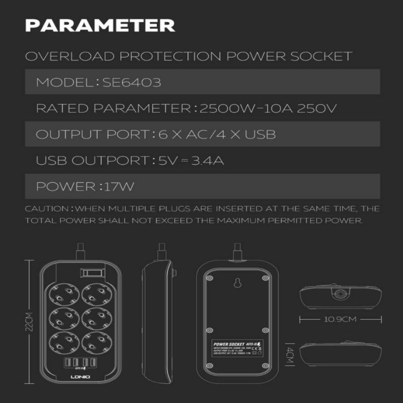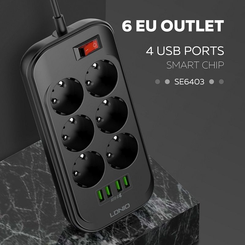 LDNIO SE6403 – это многофункциональный сетевой фильтр удлинитель с длиной провода 2 метра, предназначенный для подключения и зарядки различной техники.